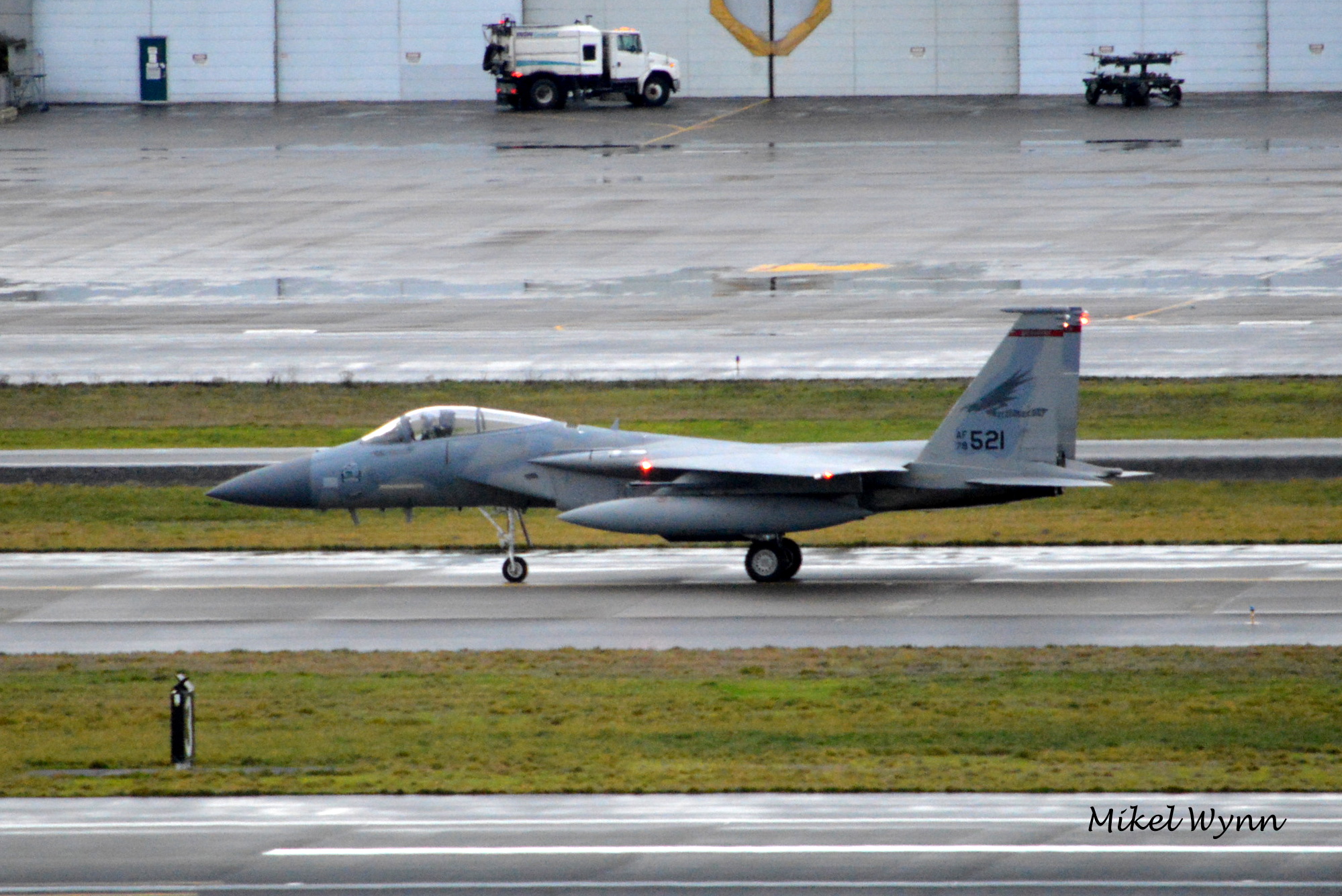| Oregon Air National Guard McDonnell Douglas F-15C Eagle (78-0521) taxiing to the military ramp after arriving back from a sortie. |